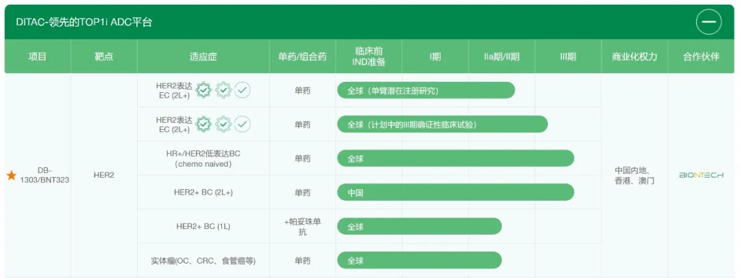 国际方面,DB-1303/BNT323已获得FDA授予的快速通道及突破性疗法认定以及国家药监局授予的突破性疗法认定,用于治疗在接受免疫检查点抑制剂治疗时或治疗后出现疾病进展的HER2表达晚期子宫内膜癌患者。此外,在一系列肿瘤(包括乳腺癌、子宫内膜癌、卵巢癌、结直肠癌及食管癌)中均观察到DB-1303/BNT323的治疗反应,并得到来自美国、中国、欧洲、澳大利亚及其他国家患者的全球临床数据的支持。