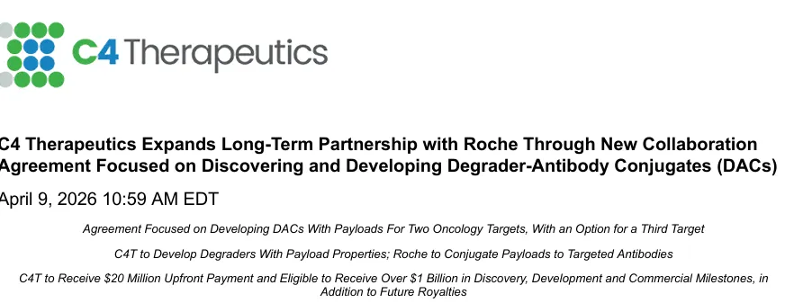 C4T将为这两个项目获得2000万美元的预付款。如果罗氏行使其对第三个靶点的选择权,C4T将获得额外付款。在整个合作过程中,C4T将获得近期发现里程碑付款。C4T有资格获得超过10亿美元的发现、监管和商业里程碑付款。此外,C4T有权在未来的销售中获得分层特许权使用费,但在合作协议中所述的某些情况下可以减少。