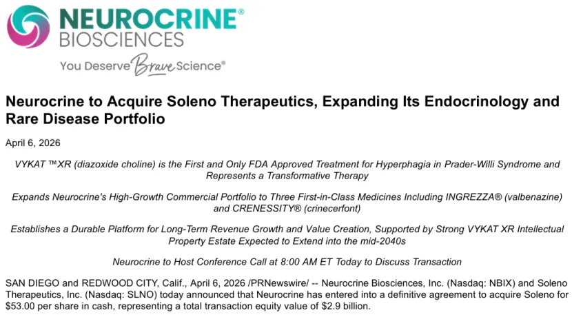当地时间4月6日,神经科学领域的巨头 Neurocrine Biosciences 宣布,将以每53美元现金的价格收购 Soleno Therapeutics,总交易股权价值高达29亿美元。这一报价较 Soleno 4月2日的收盘价溢价约34%,较其30天成交量加权均价溢价51%。