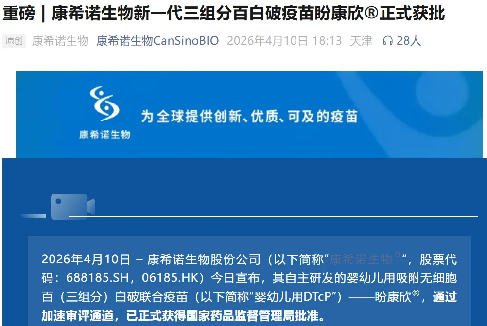 最近,康希诺生物扔下了一颗重磅炸弹——他们自主研发的国内首个婴幼儿吸附无细胞百(三组分)白破联合疫苗盼康欣®”,在2026年4月10日正式获得了国家药监局的批准。