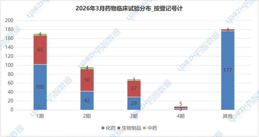 2026年3月,据药智数据企业版【中国临床试验】数据库显示CDE公示登记的药物临床试验共计498个临床试验登记。其中,化药临床试验以345项占据主要,生物制品和中药则分别为142项和11项。