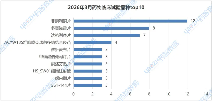 在2026年3月CDE登记的药物临床试验品种top10榜单中,“非奈利酮片”以12个登记试验位列榜首,且都为生物等效性临床试验。“非奈利酮片”的12个临床试验分别由浙江兄弟药业有限公司、江苏吴中医药集团有限公司苏州制药厂、齐鲁制药有限公司等公司申办,针对的临床试验适应症都为“与2型糖尿病相关的慢性肾脏病成人患者(伴白蛋白尿),以降低肾小球滤过率估计值(eGFR)持续下降、终末期肾病、心血管死亡和因心力衰竭住院的风险”。“多替诺雷片”以8个临床试验位列第二,均为生物等效性临床试验。