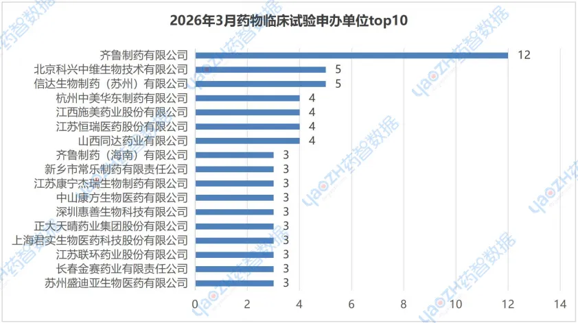 在2026年3月的CDE药物临床试验申办单位排行榜中,“齐鲁制药有限公司”以12个临床登记试验位列榜首,“齐鲁制药有限公司”的12项试验涵盖了10个不同品种的临床试验,既有新药临床试验,也有生物等效性试验,具体为“非奈利酮片、多替诺雷片、艾地苯醌片、QL2109 注射液”等;“北京科兴中维生物技术有限公司”以5个临床登记试验位列第二,且5个临床登记试验全部为新药临床试验。