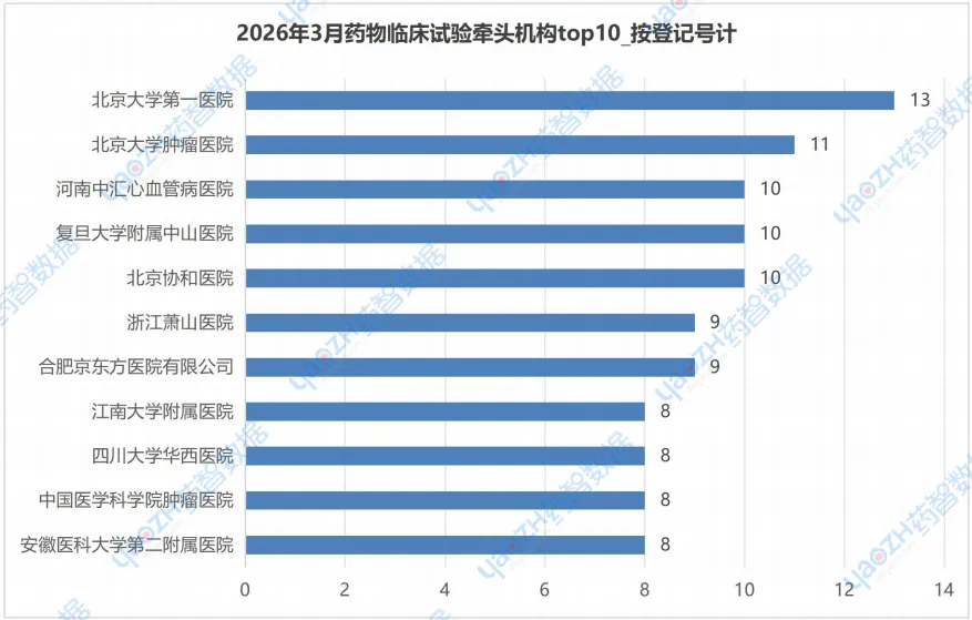 在2026年3月的CDE药物临床试验登记公示中,“北京大学第一医院”以牵头13个临床试验位列榜首,且这13个临床试验绝大多数为新药临床试验。