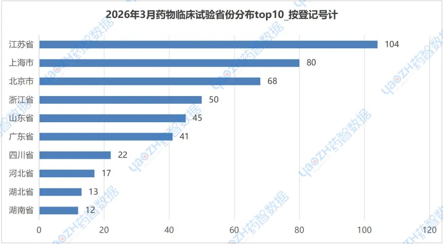 在2026年3月的CDE药物临床试验登记公示中,按申办单位所在地区统计,临床试验省份分布见下图,江苏以104个临床试验登记位居首位,上海和北京位列第二和第三。更多详细信息,请详见下图或访问药智数据企业版【中国临床试验】数据库进行查询。