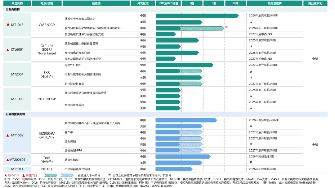 作为全球首创的CaSR/OGP双靶点受体激动剂多肽药物,MT1013 在麦科奥特首次递表时(2025年9月底),注册III期临床完成首例患者入组;截至 2026 年 3 月底,该产品中国关键注册 III 期临床试验已完成方案设定的全部 424 例患者入组,临床推进速度超预期,为 2026 年底完成 III 期研究、后续 NDA 申报奠定了核心基础。