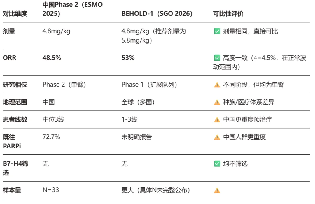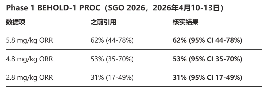 Mo-Rez在最新披露的BEHOLD-1研究中在铂耐药性卵巢癌(PROC)最高剂量组的ORR为62%(5.8 mg/kg,21/34)、晚期/复发性子宫内膜癌(EC)最高剂量组的ORR为67%(4.8 mg/kg,8/12),且均为确认缓解,在中位4-6个月随访时仍持续。值得注意的是,这也是Mo-Rez首次公布全球临床数据(患者治疗线数为1-3线),过往均为国内数据。