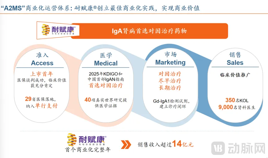这份成绩单的功臣之一,是耐赋康。在IgA肾病一线治疗中具有基石地位的耐赋康,在第一个商业化完整年便实现了14.4亿元销售额,同比增长超过300%,创造了慢病药纪录。