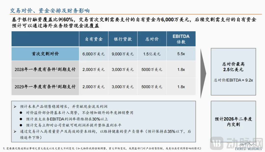 值得注意的是,这笔交易的公允性还得到了多重机制保障。首先,朴谷咨询作为独立评估师,基于市场法及2025年EBITDA(2727万美元)给出的评估值为3.2亿美元,而本次交易最高总对价2.5亿美元相对评估值折让约22%,交易对价低于独立估值。其次,交易总对价为2.5亿美元分三期支付,交易首次交割需要支付的自有资金为6000万美元,后续交割需支付的自有资金预计可以通过海外业务经营现金流覆盖。