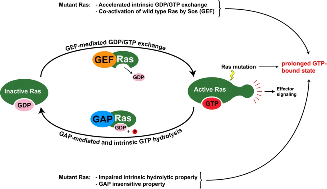 RAS蛋白(包括KRAS、HRAS、NRAS)是调控细胞增殖与存活的核心分子开关,作为GTPase在GDP结合的"关闭"(OFF)状态和GTP结合的"激活"(ON)状态之间循环切换。正常生理条件下,RAS的开关由上游受体酪氨酸激酶(RTK)信号严格调控,GTP水解酶活性使RAS自动回到OFF状态。然而一旦发生点突变(最常见为第12位甘氨酸突变,如G12C、G12D、G12V等),RAS就会被"锁定"在GTP结合的持续激活状态,不断驱动MAPK/ERK和PI3K等下游增殖通路,成为众多实体瘤最核心的致癌驱动因素之一。