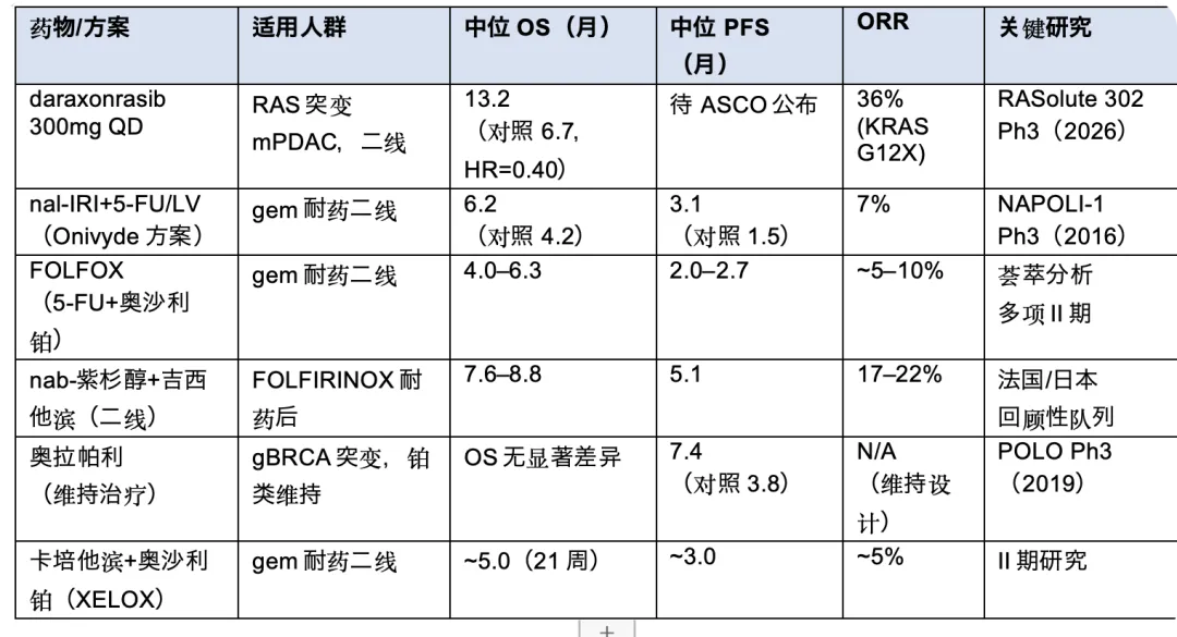 2025年ASCO GI会议公布更新数据显示,在接受推荐二期剂量(RP2D,300mg QD)的59例二线胰腺癌患者中,KRAS G12X突变亚组(n=22)中位PFS达8.8个月,所有RAS突变亚组(n=37)中位PFS为8.5个月,客观缓解率(ORR)分别为36%和27%,疾病控制率(DCR)高达91%和95%。这些单臂数据已经远超历史对照,FDA随即授予daraxonrasib针对KRAS G12X突变mPDAC二线治疗的突破性疗法认定(BTD)和孤儿药认定(ODD)。