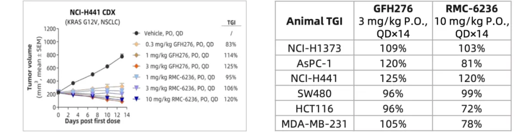 GFH276在临床前研究中的核心数据同样惊艳:在RAS突变细胞系中,GFH276对MAPK通路(pERK1/2)的抑制迅速且深度;在KRAS G12C、G12D、G12V突变及HRAS/NRAS突变的肿瘤模型中均展示出广谱抗肿瘤活性;在多个KRAS突变体肿瘤异种移植模型中,GFH276以显著低于RMC-6236的等效剂量实现了等效乃至更优的肿瘤退缩,同时展现出优越的跨种属(小鼠/大鼠/犬)口服生物利用度(39%–113%),为后续临床剂量选择奠定了有利基础。