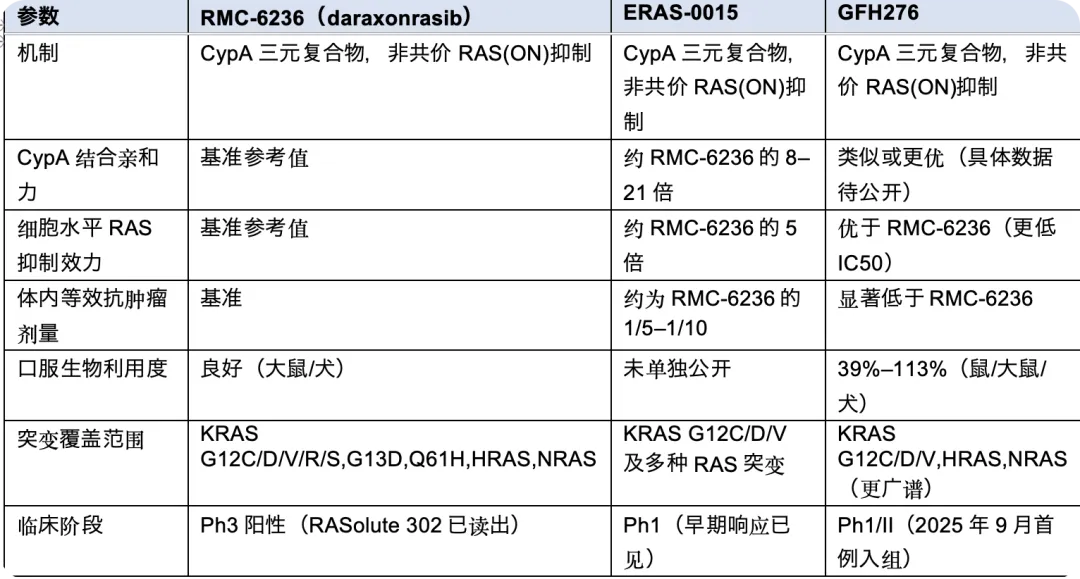 劲方的GFH276同样值得给出高预期,它是自身原研的口服pan-RAS(ON)抑制剂,同样采用CypA分子胶水三元复合物机制。GFH276在2025年AACR年会上连续发布临床前数据,引发广泛关注,被业界视为全球临床进度最靠前的三大pan-RAS(ON)分子之一。