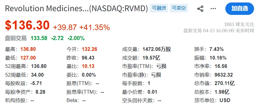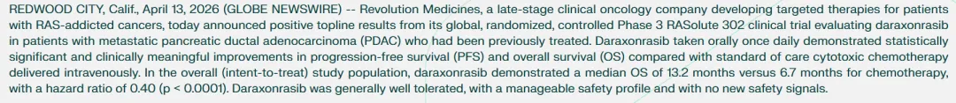 2026年4月13日,Revolution公布其胰腺癌药物Daraxonrasib(RMC-6236)的III期临床试验积极结果:患者中位生存期延长近一倍。受此消息影响,Revolution股价大涨超过40%,市值跃升至270亿美元。市场预计,Daraxonrasib的峰值销售额有望达到约120亿美元。