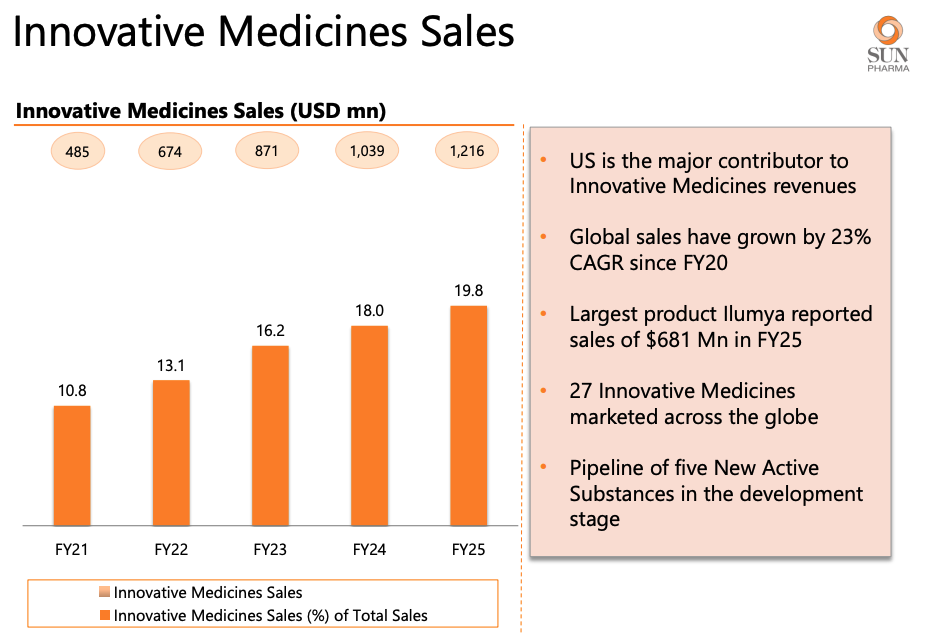 2025 财年,太阳制药创新药收入已经达到 12.16 亿美元,同比增长 17.1%,主要由 Ilumya(替拉珠单抗)、Winlevi(克拉考特)、Cequa(环孢菌素 A 滴眼液)和 Odomzo(索尼德吉)等核心产品驱动。2026 财年前三季度,其创新产品销售额更是突破了十亿美金,达到 10.67 亿美元,同比增长 15.7%。
