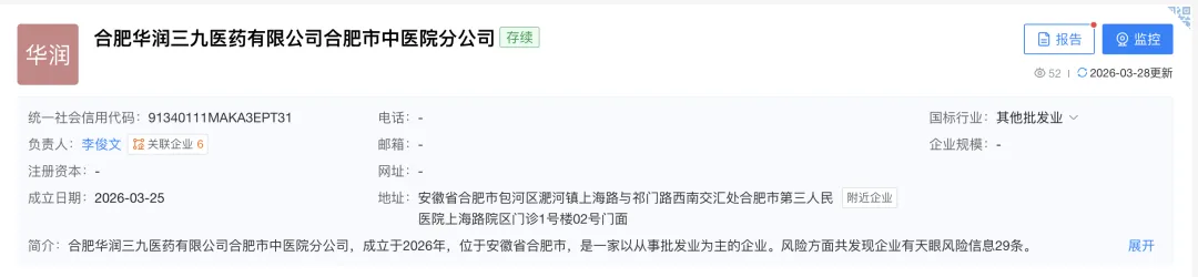 天眼查数据显示,近日,合肥华润三九医药有限公司合肥市中医院分公司成立,其总公司为合肥华润三九医药有限公司。