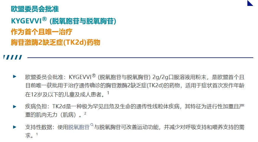 作为全球首个且唯一用于治疗TK2d的药物,KYGEVVI被FDA审批通过后,又成功进入欧盟。这意味着TK2d这一长期几乎只有支持治疗可用的超罕见致命疾病,终于在主流监管市场连续迎来突破。