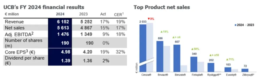 近几年,这一策略逐渐迎来价值兑现期。rozanolixizumab、Zilucoplan在2023年陆续上市欧美。UCB已经形成新老产品协同支撑增长的格局。2024年收入达到 61.5 亿欧元,同比增长 17%。