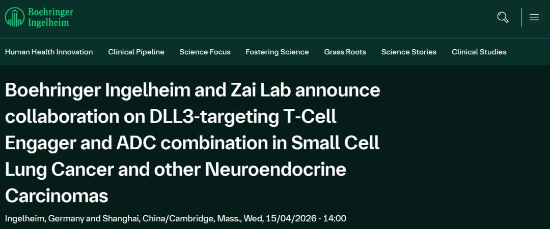 当地时间4月15日——再鼎医药(纳斯达克股票代码:ZLAB;香港联交所股份代号:9688)与勃林格殷格翰宣布了一项临床合作,着力开发一种创新的双DLL3靶向药物联合疗法。Ib/II期研究将评估再鼎医药的靶向DLL3的ADC zocilurtatug pelitecan(zoci,原名ZL-1310)与勃林格殷格翰的DLL3/CD3 T细胞衔接器obrixtamig联合使用的安全性、耐受性及初步临床活性。该研究将招募患有低分化NEC及广泛期小细胞肺癌(ES-SCLC)的患者,这些患者亟需更有效的治疗选择。