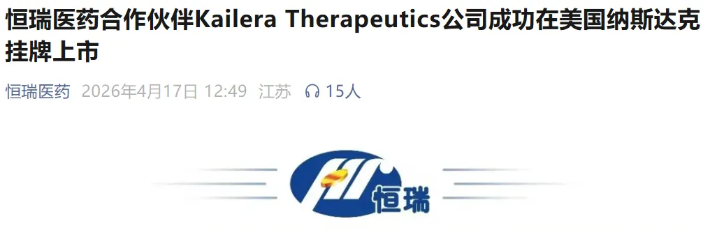 美国东部时间2026年4月16日,恒瑞医药的战略合作伙伴Kailera Therapeutics(股票代码:KLRA)正式在纳斯达克挂牌上市。本次发行预计募资总额达6.25亿美元(未扣除承销折扣、佣金及发行费用),且不包括承销商行使超额配售权购买额外股份的可能。