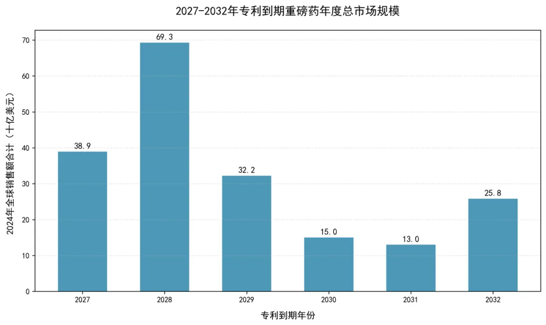注:根据行业公开数据,2027-2032年期间共有69款年销超10亿美元的重磅药面临专利到期,目前公开可查的详细信息仅覆盖上述35款核心品种。