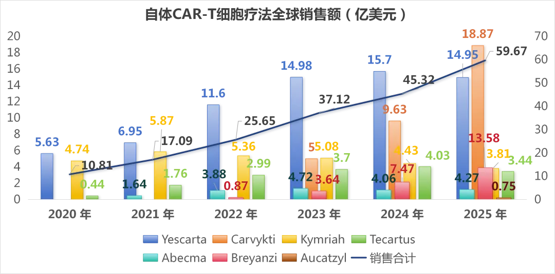 然而,CAR-T的商业化竞争愈演愈烈。强生/传奇的BCMA CAR-T Carvykti凭借优异的疗效数据建立了较强竞争力,在2025年销售额达到18.87亿美元(图1),同比大增96%,已经坐上全球第一自体CAR-T的位置。