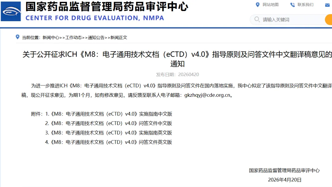 4月20日,国家药监局药品审评中心(CDE)正式发布《关于公开征求 ICH〈M8:电子通用技术文档(eCTD)v4.0〉指导原则及问答文件中文翻译稿意见的通知》,公开征求意见为期 1 个月。这标志着我国药品电子注册申报体系即将迎来自 2017 年推行 eCTD 以来最重大的一次升级,全球统一的 eCTD v4.0 标准距离在国内正式落地只差最后一步。