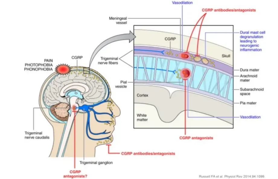 CGRP是一种由37个氨基酸组成的强效血管舒张物质,广泛分布于人体神经系统。当偏头痛发作时,三叉神经末梢会大量释放CGRP,引发脑膜血管扩张、神经源性炎症,同时增强痛觉传导,最终导致持续性头痛及相关神经症状。