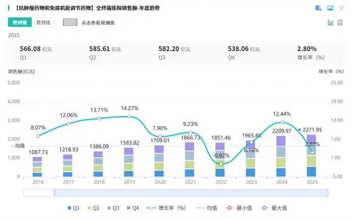 从市场层面来看,TF靶点的市场潜力虽被广泛看好,但需理性审视其实际空间。据摩熵医药数据显示,2024年我国抗肿瘤药物和免疫机能调节药物全终端医院销售额已达2209.97亿元,尽管2025年增速有所放缓(+2.80%),但庞大的存量市场为创新药提供了广阔空间,这也是TF靶点被称为“千亿赛道”的核心依据。但需要注意的是,目前TF靶向药物的临床渗透率仍处于较低水平,一方面,多数TF ADC药物仍处于临床阶段,尚未实现大规模商业化;另一方面,TF阳性肿瘤患者的筛选体系尚未完善,部分患者因靶点表达水平不足无法受益于TF靶向治疗,因此,TF靶点的实际市场空间,仍需结合临床转化率、患者筛选效率等因素理性估算。