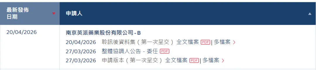 2026年4月20日,港交所官网披露,南京英派药业股份有限公司通过港交所主板上市聆讯,高盛、中金公司为其联席保荐人。这家成立于2009年、深耕合成致死机制长达十七年的创新药企业,即将正式登陆香港资本市场。