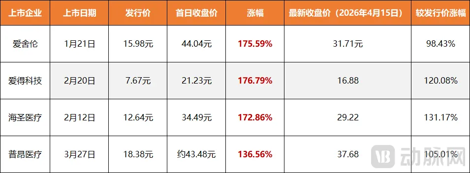 这并非昙花一现,目前4家上市企业的股价相比于发行价仍然有超过100%的涨幅,以最早上市的爱舍伦为例,截至2026年4月14日收盘,其股价为31.71元,较15.98元的发行价涨幅98.4%。这意味着,4家上市企业已成功实现了从一级市场到二级市场的价值跃升,并获得了可观的现金流支持。