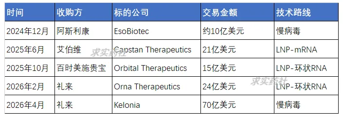 吉利德同样通过Interius BioTherapeutics布局体内CAR-T;阿斯利康则以10亿美元收购EsoBiotec,后者与Kelonia同为慢病毒技术路线。礼来此次收购之前不到两个月,刚刚以24亿美元收购了环状RNA体内CAR-T公司Orna Therapeutics,再加上这次70亿美元的Kelonia,礼来2026年仅体内CAR-T赛道就已投入近100亿美元。