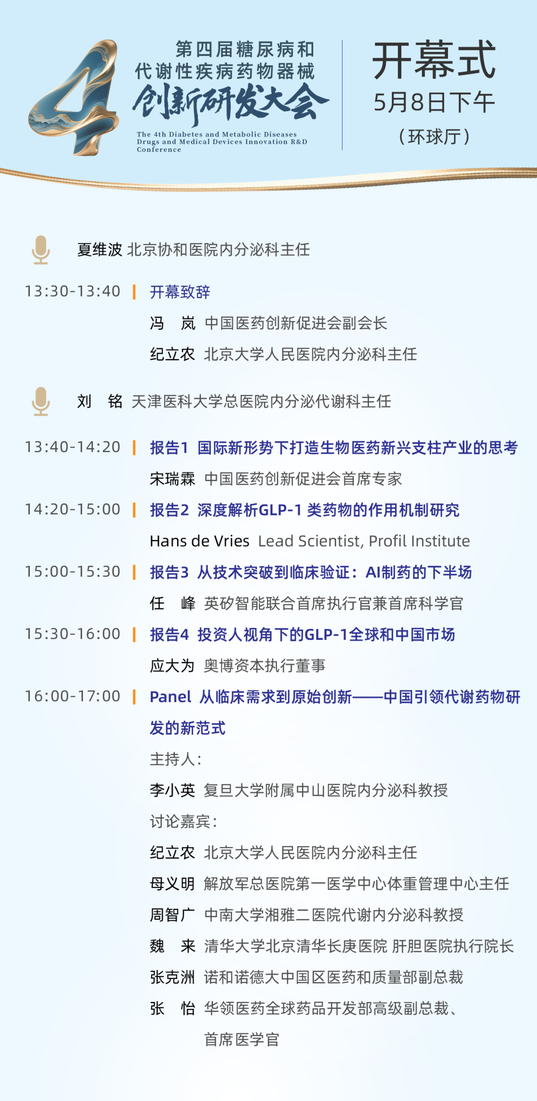直面代谢性疾病公卫挑战,把握GLP-1及多靶点药物爆发风口。从单纯降糖减重到心肾肝全面获益,中国代谢研发正迈向新高度。在此关键节点,第四届糖尿病和代谢性疾病药物器械创新研发大会将于5月8-9日在成都环球中心天堂洲际大饭店举行。
