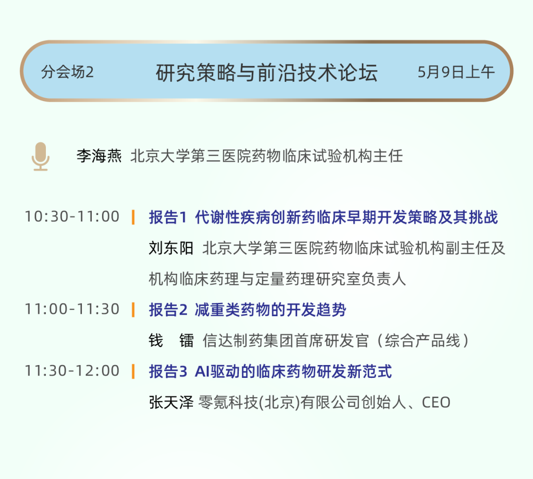 大会特设多场AI制药专题报告,集中展现人工智能对代谢药物研发全流程的赋能价值,拆解AI如何从靶点发现、分子设计到临床试验匹配实现全周期提效,探讨真实世界数据如何通过AI算法加速代谢疾病临床试验的患者招募、终点预测与方案优化。