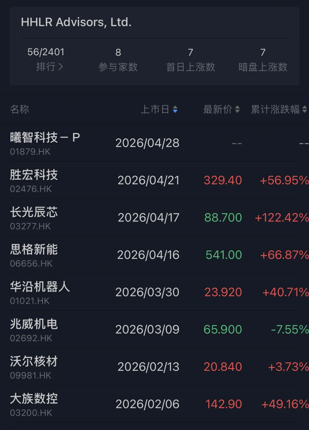 仅统计HHLR Advisors在2026年IPO基石投资的动作,目前已经参与了8家IPO项目,尽管这些项目上市时间较短,但上市累积涨幅6正1负,这个战绩可谓优秀,曦智科技作为市场热门项目,同样短期内收益表现大概率为正。