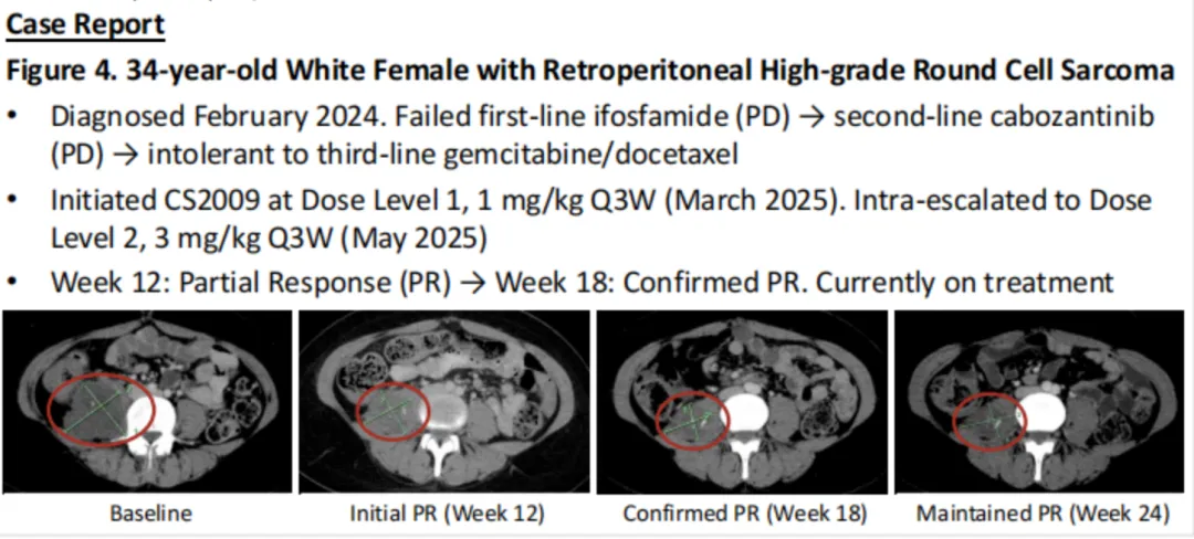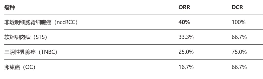 3)冷肿瘤疗效潜力(既往对PD-1单药几乎无效的瘤种) —— CS2009单药在对免疫单药反应极差的“冷肿瘤”中也展现出非常积极的疗效信号,尤其在nccRCC和STS亚组中呈现40%、33.3%的ORR,虽然各自亚组的样本量都不超过10个人,但疗效潜力意义显著。