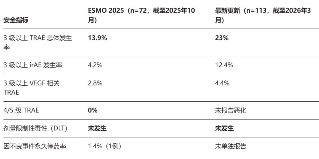 1)突出的安全性信号 —— 传统O药+Y药(CTLA-4+PD-1)组合的3级以上TRAE发生率通常在55%以上,而CS2009在增加VEGF靶点的前提下,3级以上TRAE仅23%,且全程无DLT。值得注意的是,CS2009这样的3级以上TRAE发生率,与其他同类PD-(L)1/VEGF双抗数据相近(普遍单药在20%-30%),CS2009作为增加了CTLA-4靶点的三抗难能可贵。
