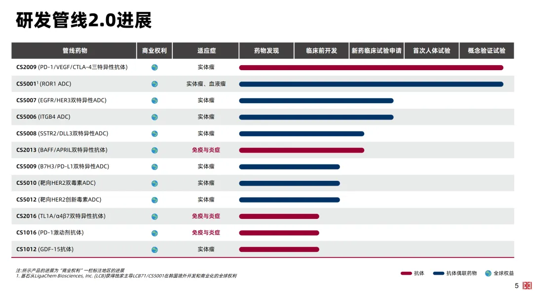 ADC(CS5001)覆盖血液瘤外,其他大量的ADC管线都在奔向实体瘤战场,比如CS5007 (EGFR/HER3双抗ADC)