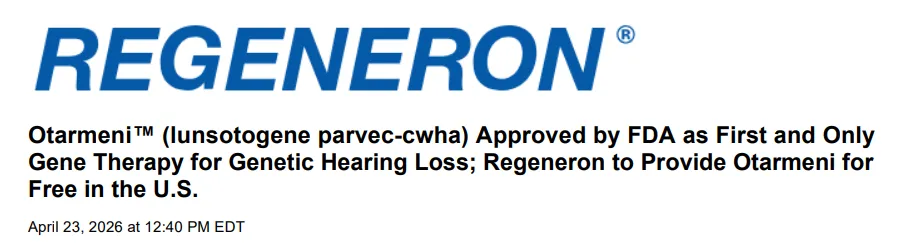 当地时间 4 月 23 日,再生元宣布,美国 FDA 已经加速批准其在研基因疗法Otarmeni(lunsotogene parvec-cwha)上市,成为首个也是目前唯一获批用于治疗遗传性听力损失的基因疗法,也是再生元首个获得批准的基因疗法。再生元将在美国免费提供 Otarmeni。根据新闻稿,Otarmeni 是首个通过 FDA 局长国家优先审评券试点项目(CNPV)批准的基因疗法,也是第二个通过 CNPV 获批的新分子实体。