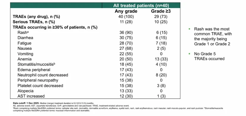 这一问题在一线治疗中依旧无法规避。单药治疗组中,38%(n=15)患者出现≥3级治疗相关不良反应(TRAEs);皮疹、腹泻、口腔炎为发生率超10%的常见≥3级不良反应。