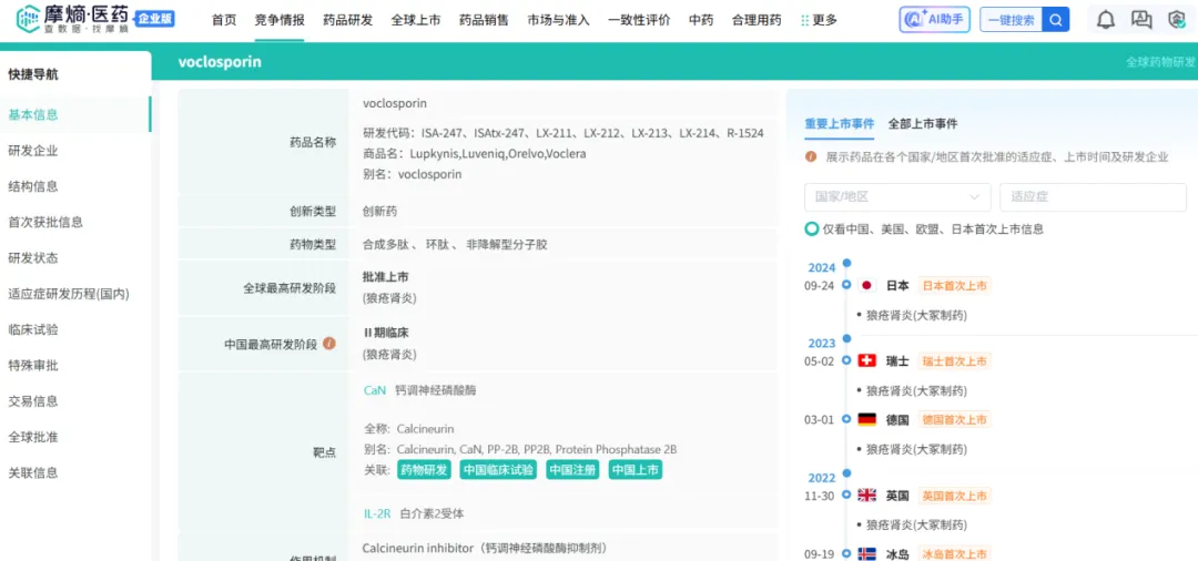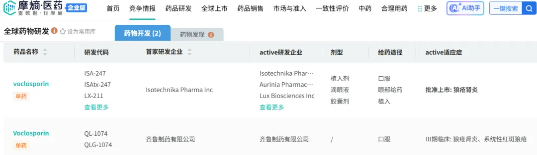 尽管LUPKYNIS(Voclosporin/伏环孢素)是目前唯一获得FDA批准用于治疗活动性狼疮性肾炎(LN)的口服治疗药物,但Aurinia面临的竞争依然严峻:已上市竞品主要是注射类药物,包括GSK的BENLYSTA(贝利尤单抗)、罗氏/基因泰克的GAZYVA(奥妥珠单抗);此外,医生仍广泛使用霉酚酸酯(MMF)联合激素或第一代CNI(如他克莫司)的超适应症治疗方案。摩熵医药数据显示,国内齐鲁制药布局了伏环孢素的改良型新药。