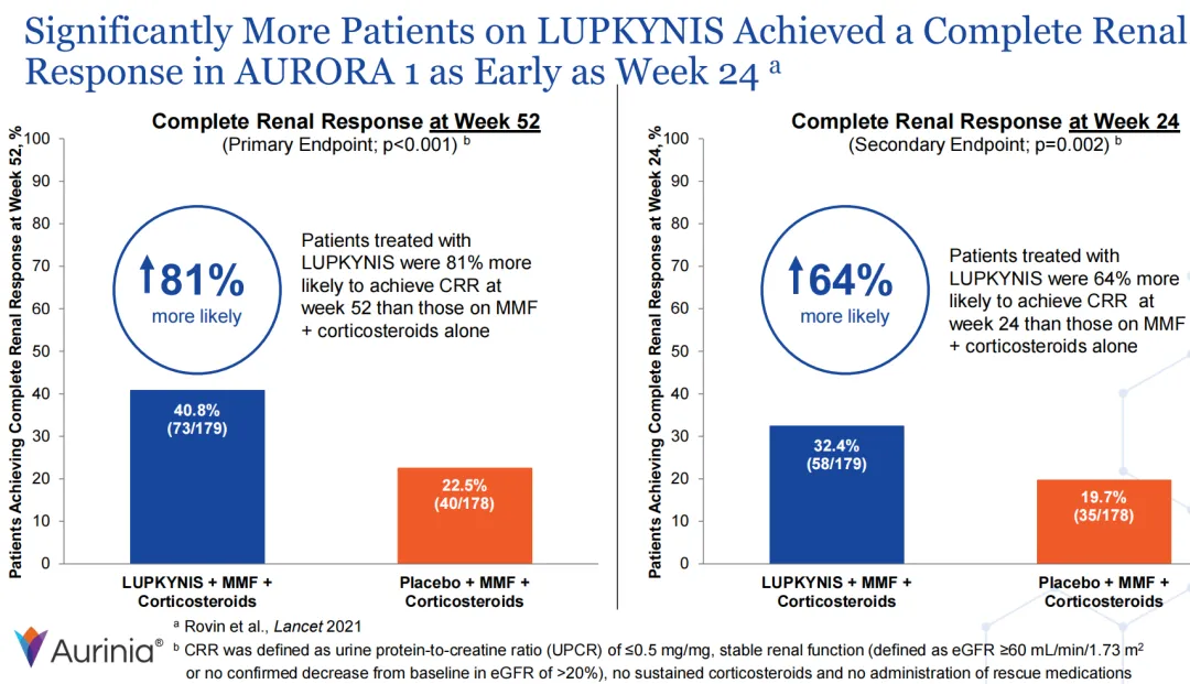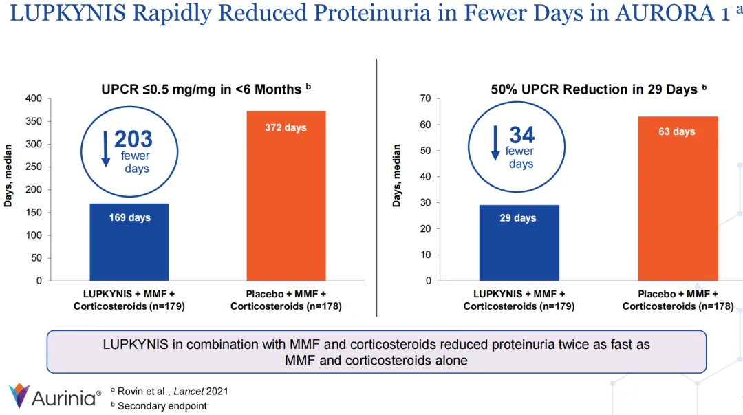 2021年1月,Aurinia推出了LUPKYNIS(Voclosporin/伏环孢素),这是一种新型结构修饰的钙调神经磷酸酶抑制剂(CNI),作为首个获FDA批准的口服疗法,用于联合标准免疫抑制方案治疗成人活动性狼疮性肾炎(LN)。