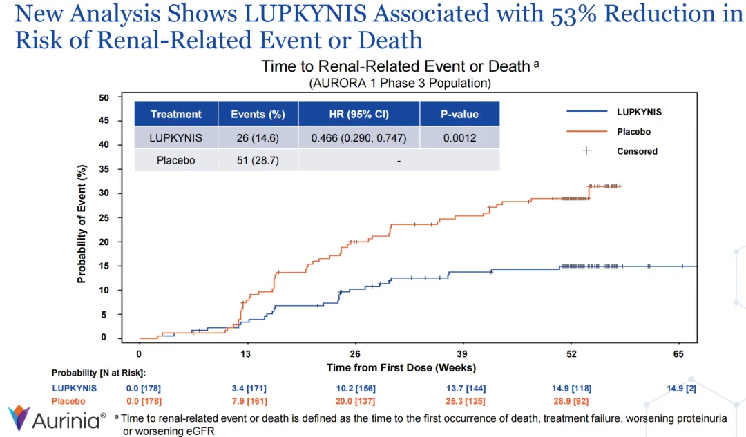 针对此前关于该药“缺乏直接临床益处”的质疑,Aurinia在2025年发布的最新事后分析提供了有力回击。基于多项关键研究数据的整合分析显示,LUPKYNIS不仅改善了替代指标,更与肾脏相关事件或死亡风险的统计学显著降低密切相关,直接证明了其改善患者长期生存预后的核心价值。此外,长达3年的AURORA 2延长研究进一步确认了该药物具有可控且稳定的安全性,未发现新的意外安全信号,确立了其作为LN长期管理方案的可靠地位。