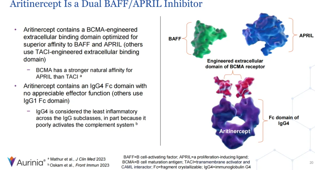 Aritinercept是一种同时针对B细胞活化因子(BAFF)和增殖诱导配体(APRIL)的双靶点抑制剂(一种重组Fc融合蛋白,来自于2021年被Aurinia收购的Thunderbolt Pharma),是目前Aurinia在研管线中的核心药物,被开发用于治疗自身免疫性疾病。