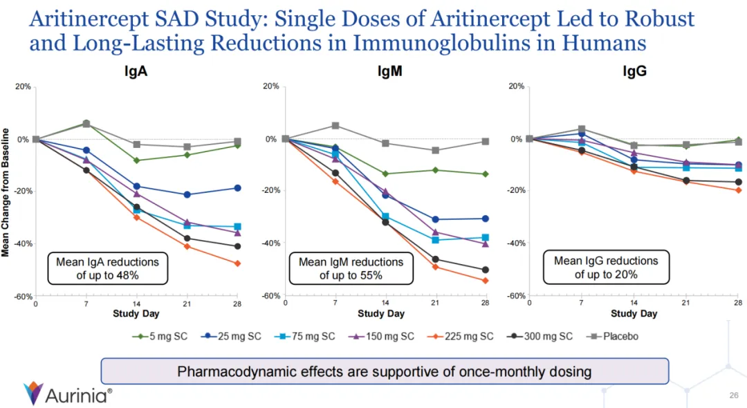 在首次人体单次递增剂量(SAD)临床试验中,Aritinercept展现了优异的安全性和药效学特征。该研究涵盖61名健康受试者,结果显示药物在所有测试剂量下耐受性良好,未发生与治疗相关的严重不良事件或导致停药的反应,常见的注射部位反应也均为轻度。更为重要的是,单次皮下注射即引发了强劲且持久的免疫球蛋白(IgA、IgM、IgG)下降,其中IgA和IgM降幅分别高达48%和55%,这种深度的生物标志物抑制效果支持了便捷的每月一次给药方案,且在产生抗药抗体的情况下仍未影响药物的安全性与药代动力学表现。