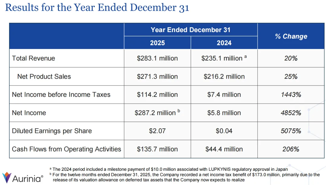 尽管Aurinia遭遇了针对核心产品的舆论风波和股价波动,但其业务基本面展现出了一定韧性:2025年,公司全年总收入达到2.831亿美元,同比增长20%,其中净产品销售额达到2.713亿美元,相比2024年的2.162亿美元,增长了25%。这一增长主要归因于向专业药房交付的药品盒数大幅增加,其背后驱动力是狼疮性肾炎(LN)治疗市场的进一步渗透。