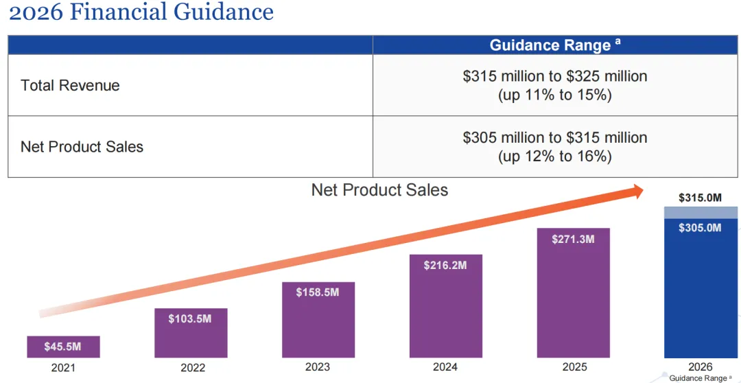 公司预计2026年总收入将增长11~15%至3.15~3.25亿美元;净产品销售额预计将增长12%~16%至3.05~3.15亿美元。