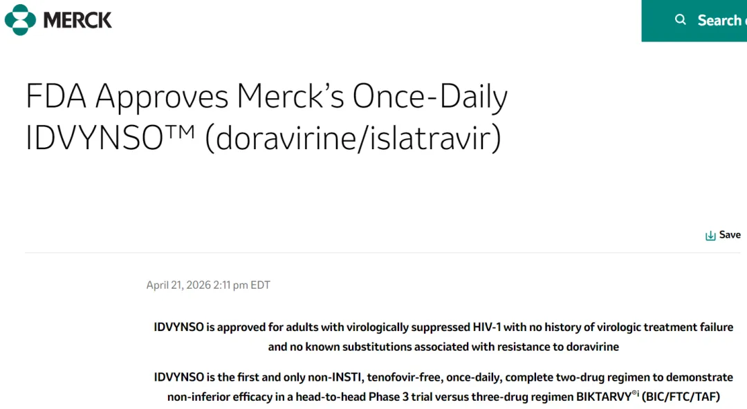4月21日,默沙东宣布,美国食品药品监督管理局(FDA)正式批准其每日一次口服双药单片方案Idvynso(doravirine/islatravir)上市,适用于已实现病毒学抑制(HIV-1 RNA低于50拷贝/mL)、抗逆转录病毒治疗方案稳定、无病毒学治疗失败史且不存在与多拉韦林耐药相关已知突变的HIV-1感染成人患者,用于替代其现有的抗病毒治疗方案。