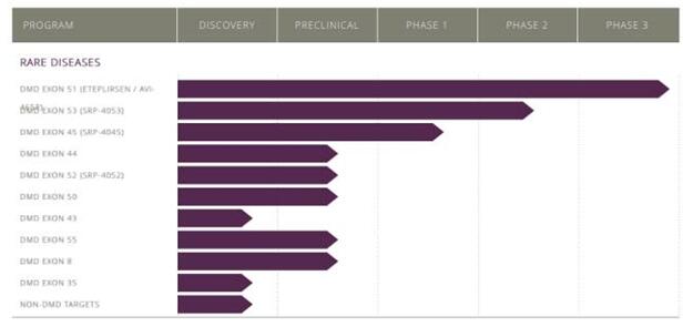 Sarepta公司致力于研究和发展独特的靶向RNA的方法治疗罕见病、传染病及其它疾病。该公司目前首要目标之一是快速推进其DMD候选药物的研发,包括其首要候选药物,针对51号外显子跳跃的eteplirsen。