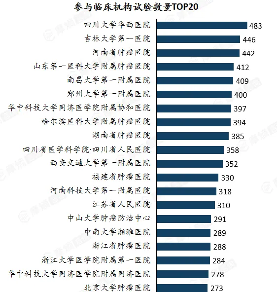 在TOP20临床机构名单中,综合性三甲医院和专科龙头医院占据了主导地位。其中,四川大学华西医院以483项试验高居榜首,吉林大学第一医院(446 项)、河南省肿瘤医院(442 项)分列二、三位。